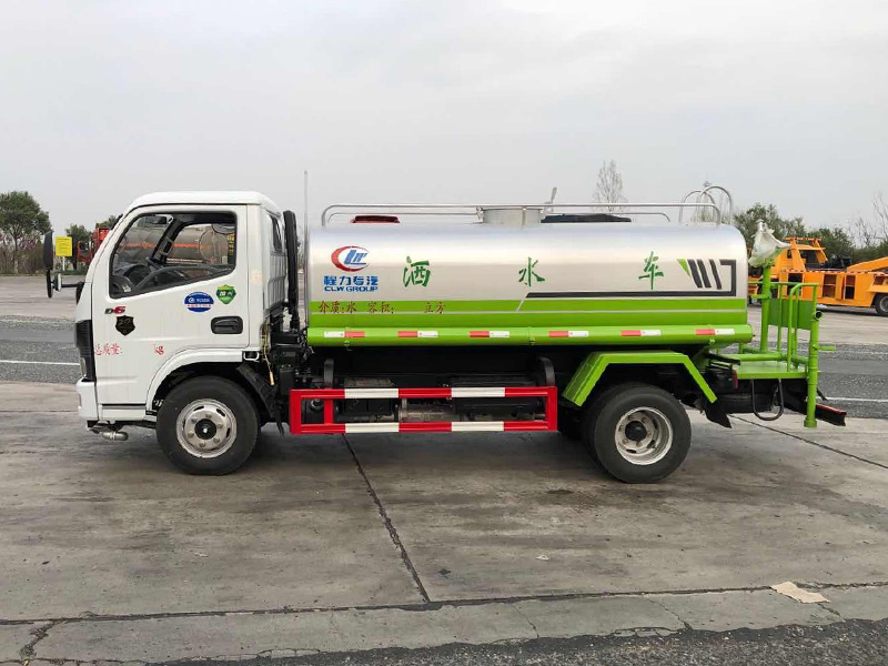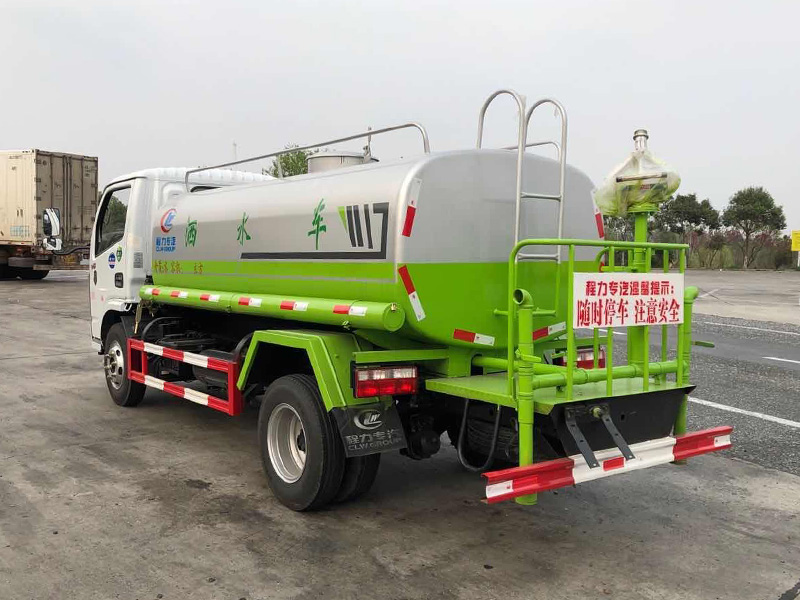 洒水车罐体结构为方圆形,采用优质碳钢板制成,国际先进的机器焊接,对接焊工业。罐体水仓分为2或3室,仓内隔板下端有通孔,具有防波防荡作用。