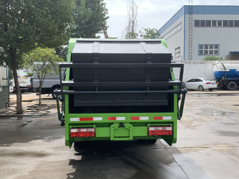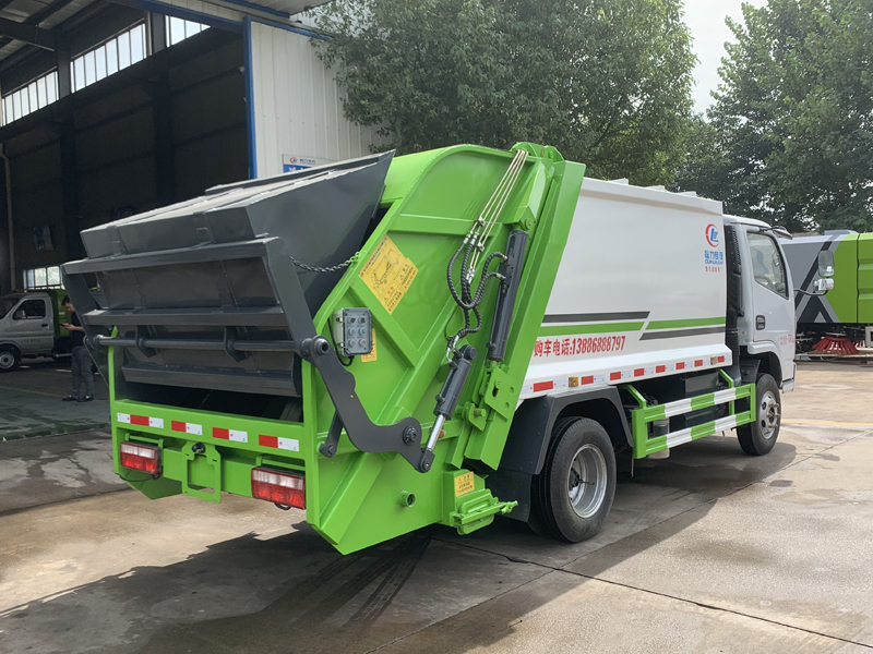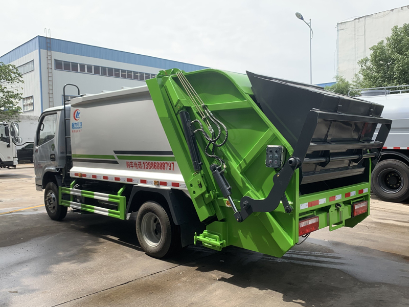 上装配置:弧形厢体,箱体采用高强度钢板,箱体厚度为边4MM底4MM采用嘉善取力器,国内著名品牌油缸,填装器举升油缸带进口平衡阀,高密度高压油管,高压多路阀和油泵,,电控手动双操作器,驾驶室与车尾部双控制箱,采用光电开关,采用CAN总线控制器电控系统,填充器左侧安装一个急停开关,具有自动反复压缩以及蠕动压缩功能,全车活动部位均有黄油嘴带防尘帽,保证黄油能进入运转内部,尾部带3cm厚橡胶密封压条,带污水收集箱,带污水槽。尾部带翻转上料机构,可选挂120升、240升、660升塑料桶或者铁桶。