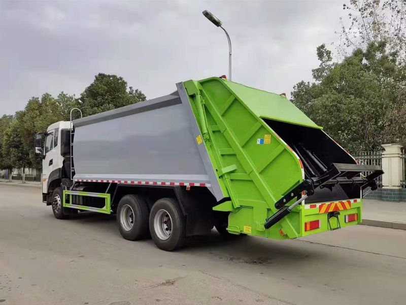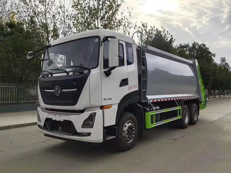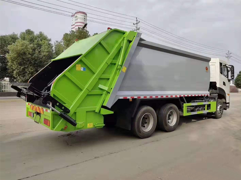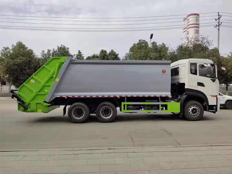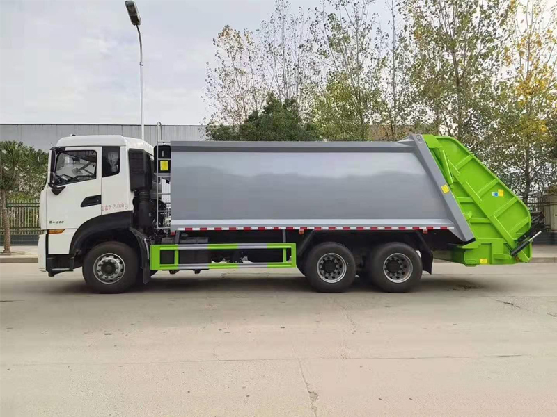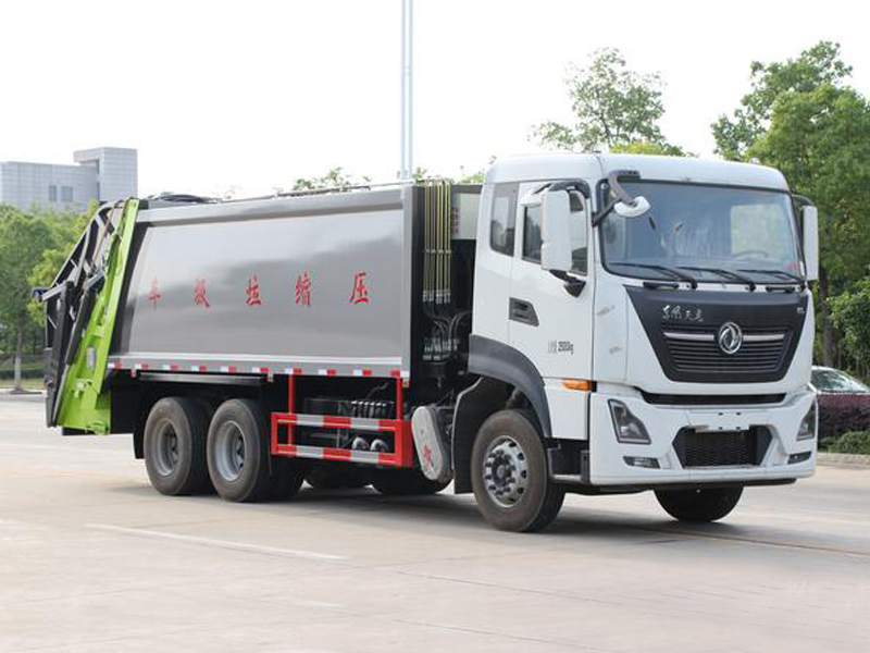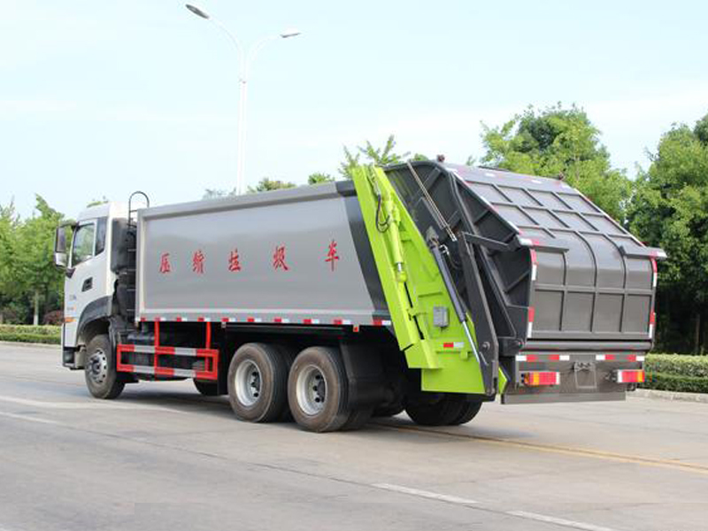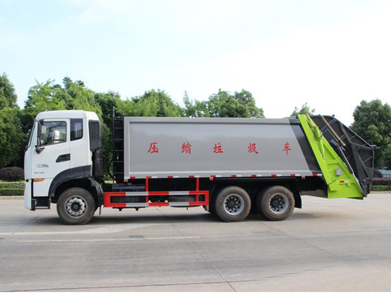 上装配置:弧形厢体,箱体采用高强度钢板,箱体厚度为边4MM底5MM采用嘉善取力器,国内著名品牌油缸,填装器举升油缸带进口平衡阀,高密度高压油管,高压多路阀和油泵,,电控手动双操作器,驾驶室与车尾部双控制箱,采用光电开关,采用CAN总线控制器电控系统,填充器左侧安装一个急停开关,具有自动反复压缩以及蠕动压缩功能,全车活动部位均有黄油嘴带防尘帽,保证黄油能进入运转内部,尾部带3cm厚橡胶密封压条,带污水收集箱,带污水槽。尾部带翻转上料机构,可选挂120升、240升、660升塑料桶或者铁桶。