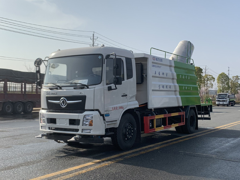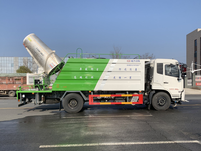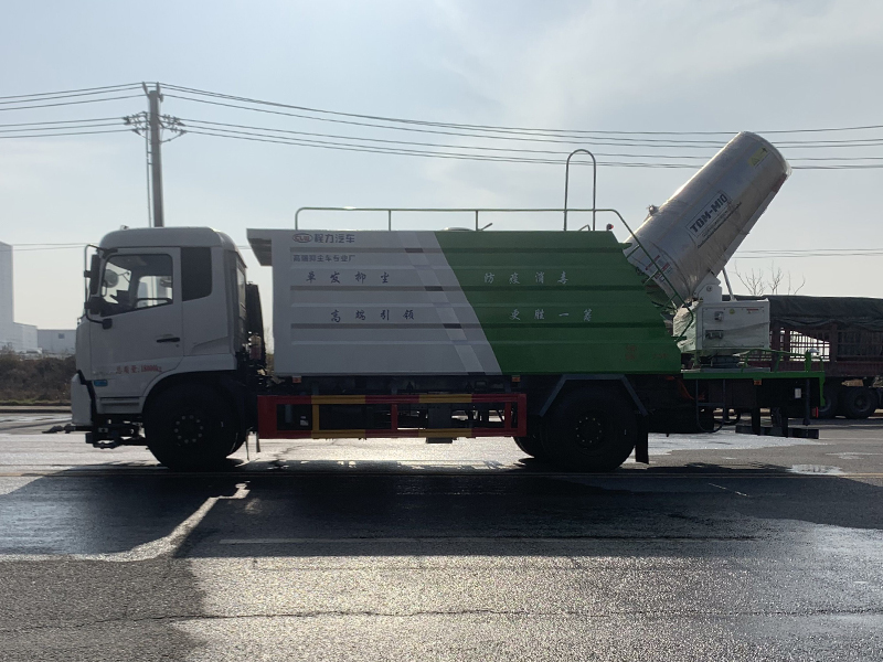 程力牌CL5180TDYD6YC型多功能抑尘车是程力专用汽车股份有限公司研制开发的一款新型抑尘车。该车采用东风商用二类底盘改装,加装专用作业装置及控制系统改装而成。专用作业装置包括雾炮系统和低压水路系统,其中雾炮系统包括柴油发电机组,水泵,雾炮等。洒水系统配置了前对冲冲洗装置(或中对冲冲洗装置)、后洒水装置、侧绿化浇灌装置以及高射程水炮。