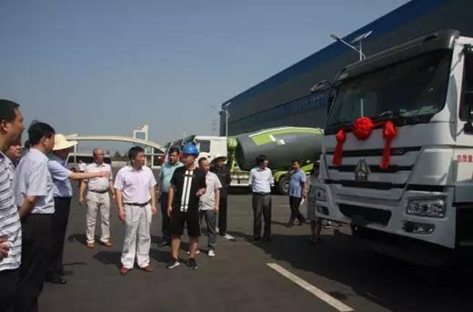 搅拌车车间负责人罗文健陪同各位领导参观待发乌鲁木齐的成品搅拌车。